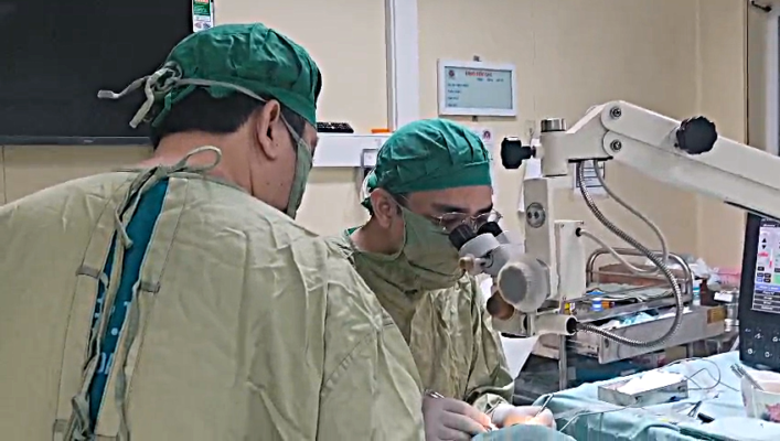 Các bác sĩ đang thực hiện ca phẫu thuật thay đục thủy tinh thể bằng phương pháp Phaco